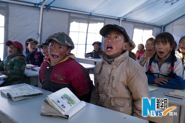 在玉樹隆寶鎮帳篷學校里,孩子們在教室里上課(4月27日攝)。新華社記者 劉杰攝