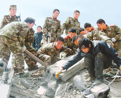 武警青海總隊玉樹支隊官兵在尋找幸存人員。于文群攝