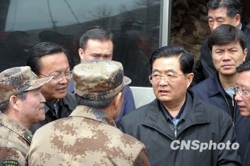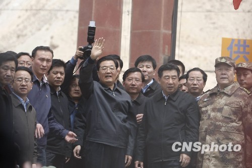 4月18日,中共中央總書記、國家主席、中央軍委主席胡錦濤飛抵玉樹,看望慰問地震災區干部群眾,實地指導抗震救災工作。 中新社發 盛佳鵬 攝