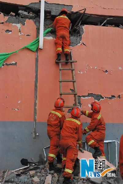 4月15日,西藏消防總隊昌都消防支隊官兵在損壞的樓體中搜救。當日,根據群眾提供的情況,西藏消防總隊首批赴青海玉樹的昌都消防支隊地震救援分隊官兵在玉樹縣城扎西大通西路24號建筑工程隊小區展開救援。新華社發(劉毅 攝)