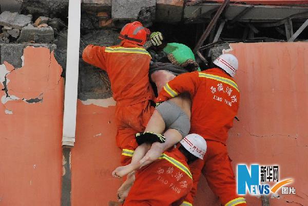 4月15日,西藏消防總隊昌都消防支隊官兵從損壞的樓體中救出一名傷員。當日,根據群眾提供的情況,西藏消防總隊首批赴青海玉樹的昌都消防支隊地震救援分隊官兵在玉樹縣城扎西大通西路24號建筑工程隊小區展開救援。新華社發(劉毅 攝)