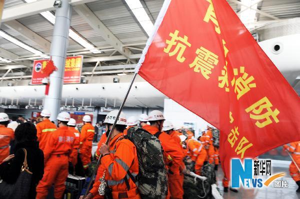 4月15日,山東地震救援隊在西寧曹家堡國際機場集結。青海玉樹發生地震后,山東公安消防總隊在全省范圍內調遣的192名救援隊員,25條搜救犬,攜帶生命探測儀等搜救工具在西寧曹家堡機場集結,并準備于當日下午乘專機趕往玉樹災區開展救援行動。