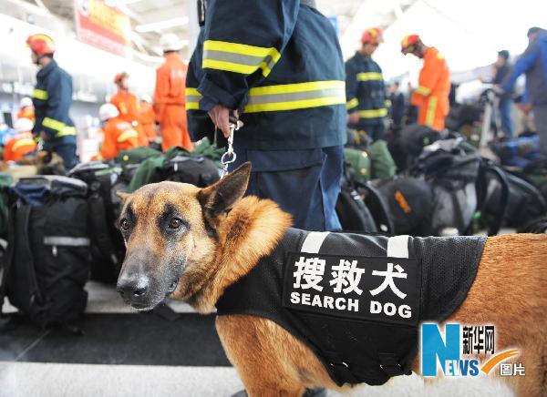 4月15日,山東地震救援隊攜搜救犬在西寧曹家堡國際機場集結。新華社記者 李紫恒 攝