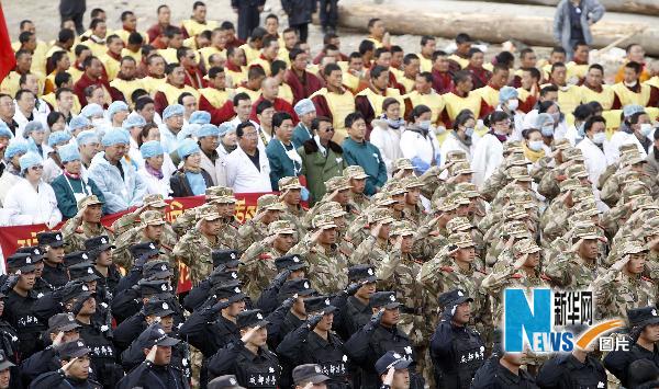 4月21日,青海玉樹“4·14”地震災區舉行哀悼活動,沉痛悼念地震遇難同胞。這是玉樹結古鎮鎮政府廣場哀悼活動主會場。新華社記者費茂華攝