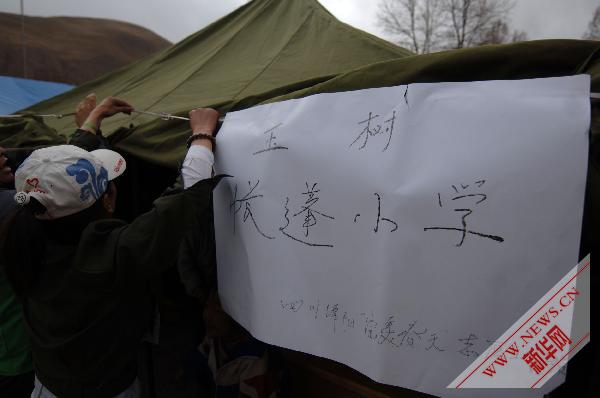 4月20日,在玉樹縣第二完全小學,志愿者將標牌掛在帳篷前