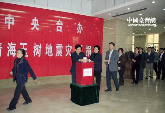 中國臺灣網(wǎng)4月20日北京消息 中共中央臺辦、國務(wù)院臺辦及海峽兩岸關(guān)系協(xié)會20日下午組織全系統(tǒng)員工進(jìn)行捐款,為青海玉樹地震中的受災(zāi)同胞獻(xiàn)上愛心。
