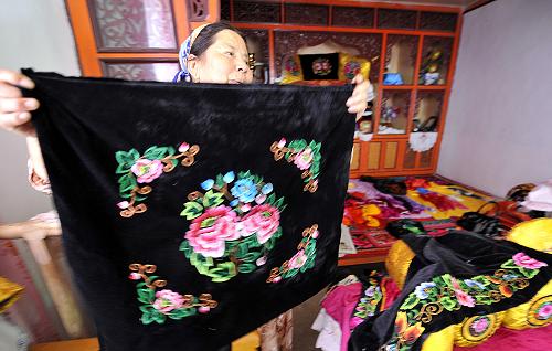 阿加汗·賽買提展示她的民族刺繡作品(7月31日攝)。現年57歲的阿加汗·賽買提是有“中國民間文化藝術之鄉”之稱的新疆哈密市回城鄉維吾爾族農民,她是當地有名的農民畫家和剪紙藝術家,更是名揚鄉里的民族手工藝刺繡能手。她的民族手工藝刺繡作品受到眾多維吾爾族群眾喜愛,年輕人結婚會整套訂制。看到商機的阿加汗·賽買提將自己的手藝傳給3個女兒,購置了專業設備,開辦起家庭式的民族刺繡加工廠。如今,她加工的民族繡品不僅銷往新疆各地,還有日本客商前來訂貨,一年能給這個家庭帶來4萬多元的收入。新華社記者 沈橋 攝