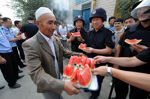 7月14日,居民阿米娜為特警隊(duì)員送上自己烤制的羊肉串。紅廟子平頂山是烏魯木齊市的一個(gè)多民族聚居區(qū)。“7·5”打砸搶燒嚴(yán)重暴力犯罪事件發(fā)生后,在此執(zhí)勤的特警隊(duì)員們沉著冷靜地維護(hù)民族團(tuán)結(jié)、維護(hù)社會(huì)穩(wěn)定,及時(shí)化解民族矛盾,排除各種不穩(wěn)定因素;利用一切時(shí)機(jī)深入各族群眾中,挨家挨戶耐心做思想教育和民族政策宣傳工作,幫助居民及時(shí)認(rèn)清“7·5”事件真相和境外“三股勢(shì)力”挑起民族矛盾的險(xiǎn)惡用心。不懈努力,逐散陰霾,各民族居民又開始相互往來(lái)交流,平頂山又恢復(fù)了往日的融洽與寧?kù)o。而這些維穩(wěn)使者們用行動(dòng)和真誠(chéng)贏得了民族聚居區(qū)群眾的信任,并與他們結(jié)下了深厚的友誼。新華社記者 李紫恒 攝