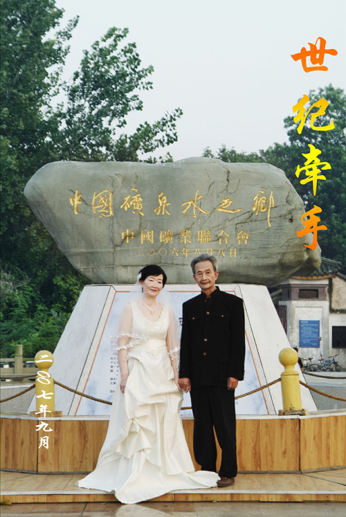 什邡臺北盛典婚紗影樓免費為兩位老人拍外景照:在家鄉--中國礦泉水之鄉碑前,留下《世紀牽手》照。(攝影:李祥)