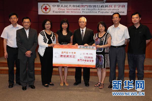 8月13日,澳門中華教育會向澳門紅十字會捐贈10萬澳門元,援助甘肅舟曲受災群眾。截至當日,澳門紅十字會共收到澳門社會各界向舟曲災區的捐款373.06萬澳門元。 新華社發 (張金加攝)