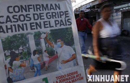 5月4日, 在薩爾瓦多首都圣薩爾瓦多,一名當?shù)厝藦囊粋關于甲型H1N1流感疫情的告示牌前走過。薩爾瓦多目前已有兩名患者被證實感染甲型H1N1流感病毒,政府稱已經采取相應措施以防止疫情擴散。 新華社發(fā)(奧斯卡·斯里維拉攝)