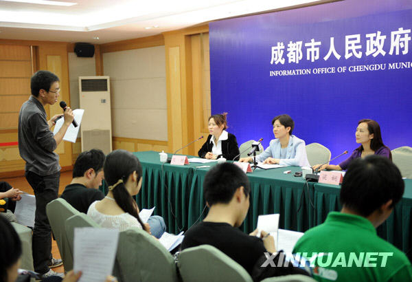 5月14日,一名記者在成都市人民政府新聞發(fā)布會(huì)上提問(wèn)。新華社記者陳?ài)茢z