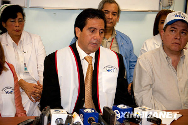 5月14日,巴拿馬總統馬丁·托里霍斯(前排中)在視察收治甲型H1N1流感患者的巴拿馬城圣托馬斯醫院后召開新聞發布會,承諾加大力度防控甲型H1N1流感。截至北京時間5月15日9時,巴拿馬公布的該國甲型H1N1流感確診病例達39例。新華社發(韓碩攝)