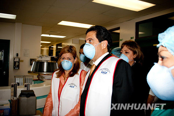 5月14日,巴拿馬總統馬丁·托里霍斯(中)在衛生部長羅薩里奧·圖爾納(左)的陪同下視察收治甲型H1N1流感患者的巴拿馬城圣托馬斯醫院。馬丁·托里霍斯在隨后召開的新聞發布會上承諾加大力度防控甲型H1N1流感。截至北京時間5月15日9時,巴拿馬公布的該國甲型H1N1流感確診病例達39例。新華社發(韓碩攝)
