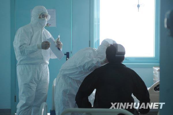 地壇醫(yī)院是北京收治甲型H1N1流感病例定點醫(yī)院,在其感染二科隔離的都是接觸甲型H1N1流感疫區(qū)來京后發(fā)熱或是與確診病例有密切接觸后發(fā)熱,需要進行醫(yī)學觀察者。這里每新接治一位發(fā)熱患者,醫(yī)護人員都會在第一時間取其咽拭子標本進行病原學檢測,如果檢測結(jié)果均為陰性,即可排除發(fā)熱者染疫可能,只待患者病情痊愈,即可出院。如果被診斷為疑似或者確診病例,則被轉(zhuǎn)運至ICU隔離病房。新華社記者 李文攝