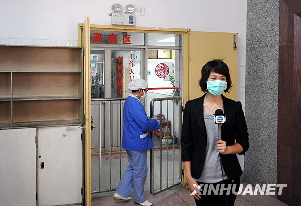 5月22日,一位電視記者在廣州市第八人民醫院收治廣州市甲型H1N1流感病例的隔離病區外采訪。