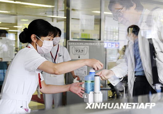 5月1日,在日本橫濱市立市民醫院,一名護士幫助訪客消毒。新華社/法新