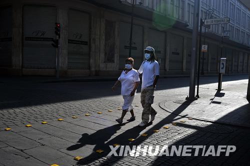 5月3日,在墨西哥首都墨西哥城,兩名戴著口罩的市民走在空蕩的街道上。墨西哥衛生部當日晚宣布,該國確診甲型H1N1流感患者人數升至568人,死亡人數增至22人。新華社/法新