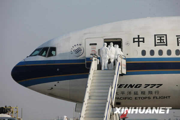 飛機在上海浦東機場平安著陸后,停靠在809號遠機位,浦東機場和檢驗檢疫局等部門立即選派專業人員,按照國家質檢總局的程序和上海市的要求,對飛機和旅客進行防疫消毒,首先上飛機對旅客和機組健康狀況進行全面掌握,確認機上人員健康無異常后,才組織旅客下飛機和卸下行李貨物,上海市有關部門按照規定隨即對乘機旅客進行隔離觀察。南航對飛機內外進行全面清潔消毒,嚴密處理客艙垃圾污水并集中焚毀。由國家衛生檢驗檢疫部門對飛機衛生狀況全部驗收合格后,飛機預計將于19時左右從上海起飛,空機飛回廣州。