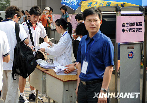 6月7日,考生在進入浙江杭州一高考考點時提交“考生健康狀況申報表”。當日,2009年全國普通高校招生全國統一考試開始進行。各級教育考試機構根據本地情況,針對甲型H1N1流感建立監測、報告制度,并做出相應安排。新華社發(周金友 攝)