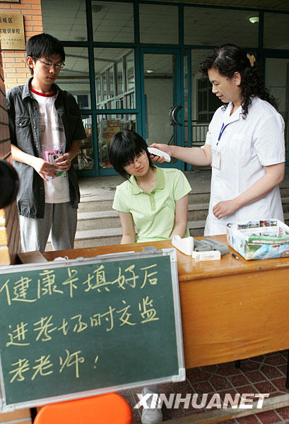 6月7日,在北京一高考考點,醫護人員為考生測體溫。當日,2009年全國普通高校招生全國統一考試開始進行。各級教育考試機構根據本地情況,針對甲型H1N1流感建立監測、報告制度,并做出相應安排。新華社發(趙冰 攝)