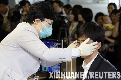 4月28日,在韓國仁川機場,工作人員為抵達機場的乘客檢查體溫。韓國疾病管理本部28日表示,一名從墨西哥旅行歸來的韓國人被確認為豬流感疑似患者,這是韓國首例豬流感疑似病例。 新華社/路透