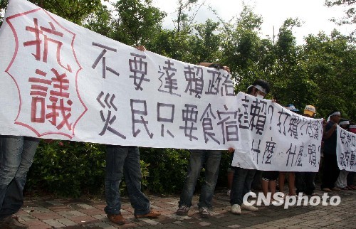 8月31日上午,來自屏東霧臺(tái)鄉(xiāng)等地的部分“88水災(zāi)”受災(zāi)民眾,打著橫幅在達(dá)賴?yán)锵麻降母咝凼猩徧稌?huì)館外抗議。中新社發(fā) 董會(huì)峰 攝