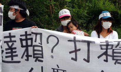 部分屏東縣霧臺(tái)鄉(xiāng)災(zāi)民31日到達(dá)賴?yán)锵麻铰灭^前抗議,指稱達(dá)賴此行不是為了災(zāi)民而是為政治目的而來。