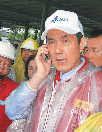 馬英九昨到嘉義縣民雄鄉(xiāng)勘災(zāi),拿手機打給臺北市消防局征調(diào)橡皮艇支持。圖片來源:臺灣《聯(lián)合報》