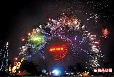 云林劍湖山的摩天輪煙火秀長達(dá)488秒,全臺(tái)最久,吸引上萬游客。煙火變化多達(dá)25種,有如絢麗七彩萬花筒,專程由臺(tái)北來的阿凱說:“聽說今年劍湖山有許愿煙火,請一天假舍棄101跨年,帶女友南下許愿。”