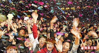 臺(tái)中市跨年晚會(huì)倒數(shù)結(jié)束后,撒下慶祝新年的紙花,民眾興奮不已。來源:臺(tái)灣《蘋果日報(bào)》