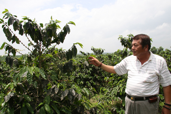 林文定向記者介紹農場里的阿拉比卡咖啡樹(攝影 邵磌)