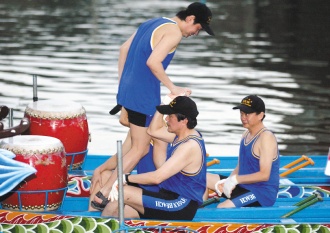 圖為2005年端午龍舟賽前,當時的臺北市長馬英九(中)與副市長金溥聰(左)互相拍手打氣的情形。右為當時另一副市長葉金川,葉也可能出任黨副秘書長。