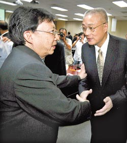 劉兆玄(左)參加國民黨中常會,離去時與吳敦義(右)握手致意;兩人今天將進行交接。