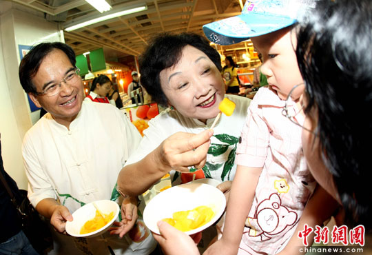 資料圖:6月16日,臺南縣縣長蘇煥智在北京統杰法寶超市西直門店主持活動,向前來購物的市民推介臺南產優質芒果。圖為蘇煥智夫婦贈送愛文芒果讓市民品嘗。中新社 杜洋 攝