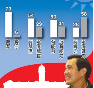 據臺灣《聯合報》民意調查發現,臺灣民眾印象中的馬英九是一個廉潔、誠信、有能力,但缺乏魄力的領導人;整體來看,馬英九獲得58%民眾的信賴。