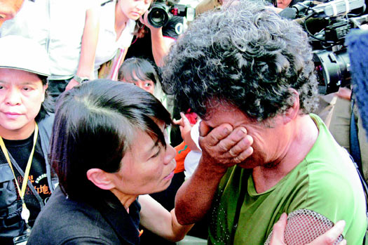 馬英九夫人周美青昨天到臺東縣嘉蘭村慰問災(zāi)民,失去家園的婦人見到她痛哭失聲,周美青半跪著緊擁婦人,輕聲安慰:“人在就好!我們還有希望。”圖片來源:臺灣《聯(lián)合報》