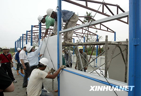 8月20日,大陸援助臺灣臺風“莫拉克”災區的首批活動板房已運抵受災嚴重的屏東縣佳冬鄉,當地工作人員已開始試裝工作。新華社發
