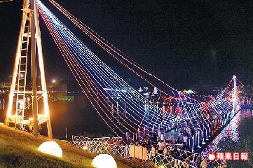 為慶祝七夕情人節(jié),主辦單位宜蘭縣政府特地在公園搭起由浮筒建造,長(zhǎng)65米、寬6米,橋梁纜繩以七彩LED管燈布置,可容納150對(duì)情侶同時(shí)度過(guò)的“鵲橋”。來(lái)源:臺(tái)灣《蘋(píng)果日?qǐng)?bào)》