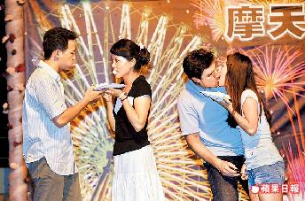 昨天七夕夜,臺(tái)北美麗華百樂(lè)園舉辦情人節(jié)闖關(guān)大考驗(yàn)競(jìng)賽,吸引不少情侶參加,游戲中女方須用嘴喂另一半棉花糖。