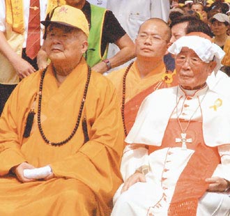 臺灣宗教領袖昨天在高雄縣的聯合祈福法會同臺,南臺灣天氣很熱,星云大師(左)、單樞機主教(右),連帽子、手巾都拿來遮陽。來源:臺灣《聯合報》