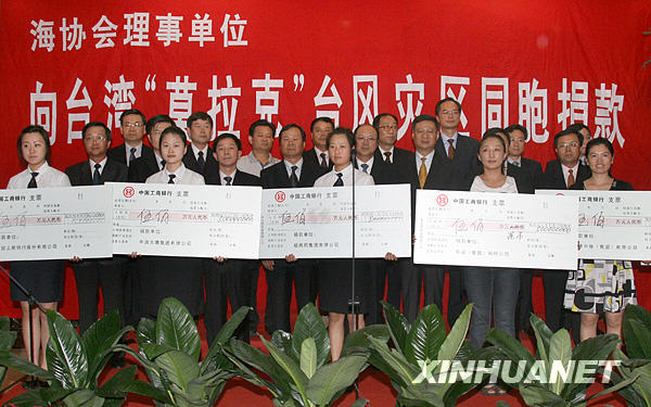 8月12日,海協會理事單位向臺灣“莫拉克”臺風災區同胞捐款儀式在北京舉行,首批共18家理事單位合計捐款1.06億元人民幣、500萬元港幣。新華社記者 邢廣利 攝