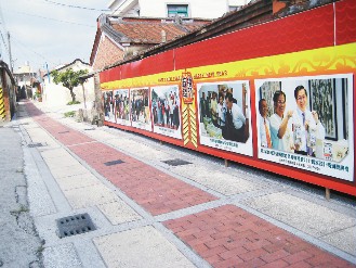 陳水扁老家巷道連小販都不見了,只見宣揚“政績”的廣告牌。