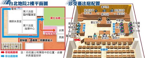 地檢署規(guī)劃,吳淑珍在下午2點(diǎn)20分能從地檢署門口下車,在搭乘法警室旁邊的電梯,直接進(jìn)到第七法庭。