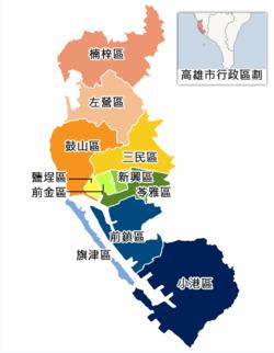 目前高雄市的轄區(qū)范圍,極東為小港區(qū)坪頂里,極西為鼓山區(qū)桃源里,極南為小港區(qū)鳳鳴里,極北為楠梓區(qū)清豐里。全市共有11區(qū)。