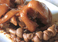 平交道旁的小店像個家庭伙食堂,身為客家人,滿婆婆做出來的鹵味頗有客家菜咸、香、油的特色,其中招牌的鹵豬腳系先炸后鹵,皮滑肉嫩;而鹵結腸則是一串腸結,乃為在燉鹵過程保持腸中津液?煽诘柠u味配上白飯,可讓人不知不覺添上好幾碗。