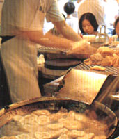 基隆廟口小吃是指位于奠濟(jì)宮附近仁三路和愛四路的小吃攤,約成“L”形,總長(zhǎng)約4、5百公尺的區(qū)域,聚集不下300多個(gè)攤位,經(jīng)過數(shù)十年的演變,這里的攤位不僅按順序編了號(hào),連招牌都整齊劃一,各式小吃種類繁多,各家皆以獨(dú)創(chuàng)口味招攬顧客,口碑遠(yuǎn)播,致使基隆廟口小吃名聞全省。 奠濟(jì)宮建于清風(fēng)吹清同治12年(1873年),乃漳州籍先民為紀(jì)念來此開墾的先祖而建,香火鼎盛,但自從小吃攤聲名大噪后,已有油煙蓋過香火之勢(shì);然于大啖美食之余,別忘到奠濟(jì)宮細(xì)細(xì)鑒賞這座百年廟宇,一窺先民精致的雕琢藝術(shù)。 廟口小吃以仁三路的攤位歷史較久,有很多是日據(jù)時(shí)代就流傳下來的,共聚集了70多家小吃攤,皆有固定的攤位 整齊的招牌,自白天就開始營(yíng)業(yè);著名的小吃有獨(dú)樹一幟的蝦仁羹、天婦羅、泡泡冰、豆簽羹和三明治等,都讓人垂涎不已。 興起較晚的愛四路則被規(guī)劃為流動(dòng)攤位區(qū),但每攤位置固定,較具代表性的攤位有八寶冬粉、奶油螃蟹、原汗豬腳大王、紅燒鰻羹,以及全家福的甜酒釀和元宵;后半段攤位則以服飾、鞋子、玩具、日用品為主,而與仁一路交接處,也有幾攤老字號(hào)的小吃,此路段于下午4點(diǎn)半左右才開始營(yíng)業(yè)。夜市白天時(shí)可通行汽、機(jī)車,下午5點(diǎn)開始管制,成為行人徒步區(qū),因此游客最好在傍晚前來,最能感受廟口夜市的魅力。 天婦羅 地址:仁三路16號(hào)攤位 營(yíng)業(yè)時(shí)間:11點(diǎn)-21點(diǎn) 天婦羅是一種日本食物,意指“炸的東西”,其實(shí)就是甜不辣,也是基隆廟口最負(fù)盛名的小吃之一。廟口賣天婦羅的攤子有好幾家,其中以編號(hào)16號(hào)的攤子最為老牌,且味美料好。每家皆采現(xiàn)做現(xiàn)炸,以魚漿加上面粉、太白粉,再以糖、鹽調(diào)味,用機(jī)器攪勻后,再用手捏制成形丟進(jìn)油鍋,配上甜醬、小黃瓜,既是一份香酥可口的美食。 豆簽焿 地址:仁三路26號(hào)攤位 營(yíng)業(yè)時(shí)間:9點(diǎn)-22點(diǎn)半 豆簽焿是基隆小吃的特產(chǎn),主要原料為“豆簽”,是以狀似黃豆帶有黑斑的米豆,磨成粉后加工制成面條狀,但比一般的面條短而薄,便是所謂的豆簽,再與魷魚羹、蝦仁羹一起在湯里煮,其湯汁則是以蝦仁、蚵仔等材料一起勾芡烹煮,料多實(shí)在,值得一嘗。 紅燒鰻焿 地址:愛四路9號(hào)攤位 營(yíng)業(yè)時(shí)間:16點(diǎn)-24點(diǎn) 這家已賣了30年的紅燒鰻焿,是廟口最有名的小吃之一,它是用新鮮的鰻魚去頭、骨刺后切成塊,沾上調(diào)味料去腥再裹上面粉油炸紅燒,然后放入大鍋中和白菜、香菇一起勾芡燴成,魚頭則煮成當(dāng)歸鰻魚頭,風(fēng)味鮮美醇口,是喜愛羹湯類食客不可錯(cuò)過的佳肴。 全家福甜酒釀元宵 地址:愛四路24號(hào)攤位 營(yíng)業(yè)時(shí)間:17點(diǎn)-24點(diǎn) 全家福的甜酒釀元宵完全是手工自制,在基隆非常知名。所謂的“酒釀”,是用白色的小糯米泡酒釀制而成,而全家福的酒釀,在香醇的酒味中還摻雜著淡淡的桂花香,嘗起來酸酸甜甜的,再加上各式手工包餡元宵,就是一碗熱乎乎的甜酒釀,此外,也可買生元宵回家自煮,惟冬至、元宵時(shí)節(jié),可得事先預(yù)訂,否則一顆難求。