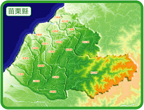 苗栗縣位于臺灣本島的中北部,北邊和東北邊與新竹縣為鄰,南邊和東南邊隔著大安溪、雪山山脈與臺中縣接壤,西濱臺灣海峽。極東點是泰安鄉梅園村的大霸尖山;極西點位于苑里鎮房里海岸;極南點是卓蘭鎮內灣里南端;極北點是竹南鎮崎頂里北端,中心點則約在獅潭鄉豐林村。全縣東西寬約64公里,南北長約50公里,面積1820.31平方公里,外型頗似一顆鉆石。海岸線長度自竹南鎮崎頂里海岸北端起,向南延伸至苑里鎮房里海岸南端止,全長約50公里。