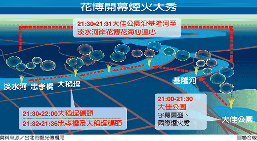 接著基隆河、淡水河到大稻埕碼頭間的六公里,將啟動(dòng)串連煙火,煙火圖案有花博LOGO、梅花及代表世界五大洲心連心的愛心煙火。還有從淡水河中緩緩升起的“臺(tái)灣站起來”,燃燒的煙火將在地圖中呈現(xiàn)百花圖案。