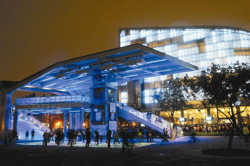 臺北花博人氣高漲,富有特色的場館令民眾驚艷,LED燈光雕出夜晚不同的風采,紅、橙、藍、白、紫各自綻放出多顏的風情。 圖片來源:臺灣《聯合報》